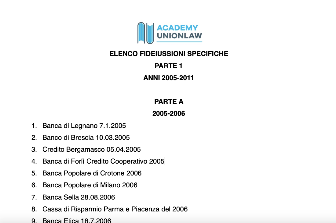 - RACCOLTA di 211 fideiussioni specifiche, con relativo ELENCO per anni per per banca, conformi allo schema abi dal 2005 al 2021. Per eventuali maggiori informazioni scrivere a info@unionlaw.it;